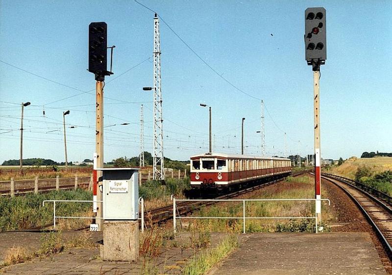 Ein 475/875er-Halbzug in Hauptstadtlack nach Birkenwerder bei der Einfahrt in Schönfließ-Sommer 1994