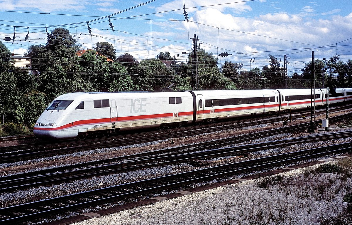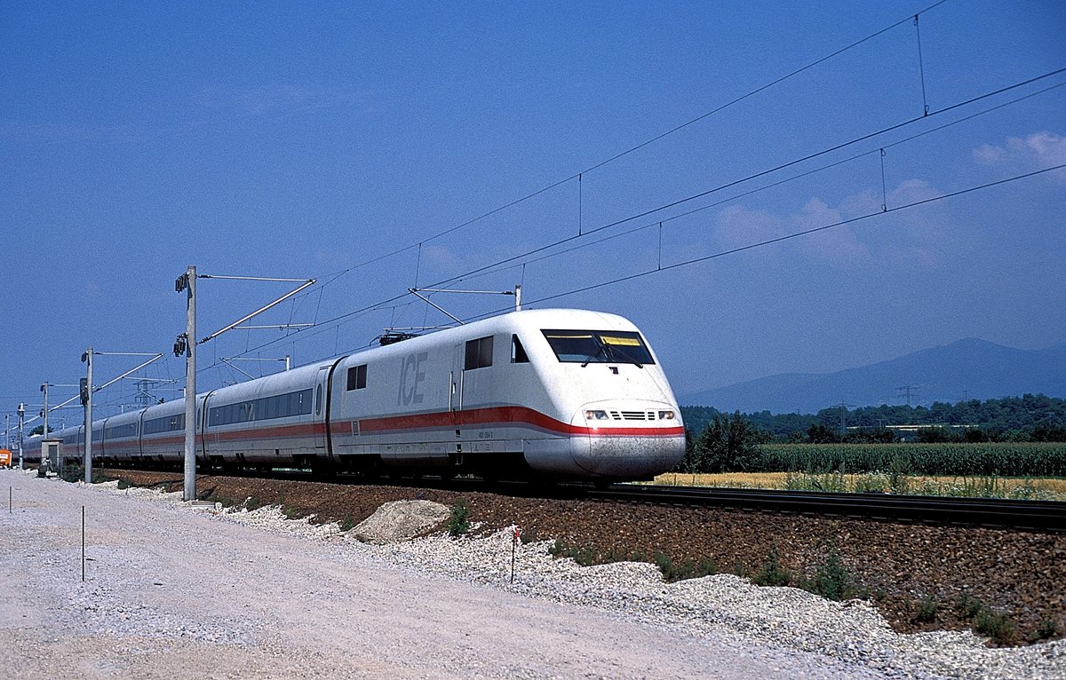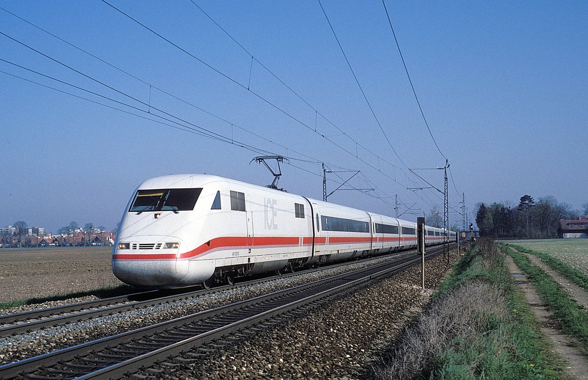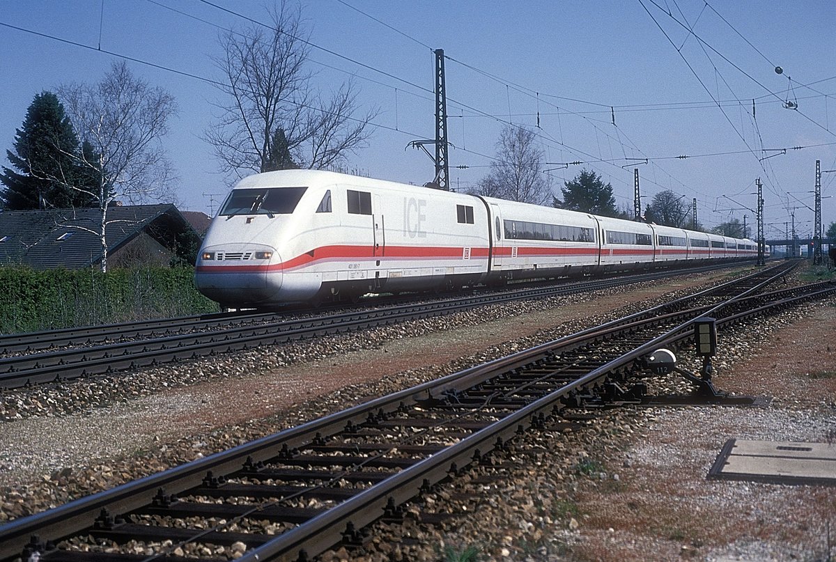 143 913 mit Dgs 52308 (Osnabrück Rbf–Maschen Rbf) und 401 074 als Lt 30898 (Bremen Hbf–Hamburg-Eidelstedt) am 25.05.1994 in Buchholz (Nordheide), aufgenommen vom Ende des Bahnsteigs 1/11 Gustav Richard