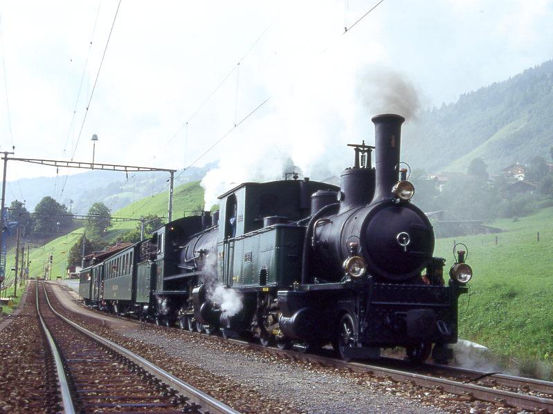 RhB Dampf-Extrazug für RHÄTIA INCOMING 3061 von Chur nach Davos-Platz vom 25.08.1995 in Saas mit Dampflok-Doppeltraktion G 3/4 1 - G 4/5 107 - B 2247 - D² 4052I - B 2246. Manfred Möldner