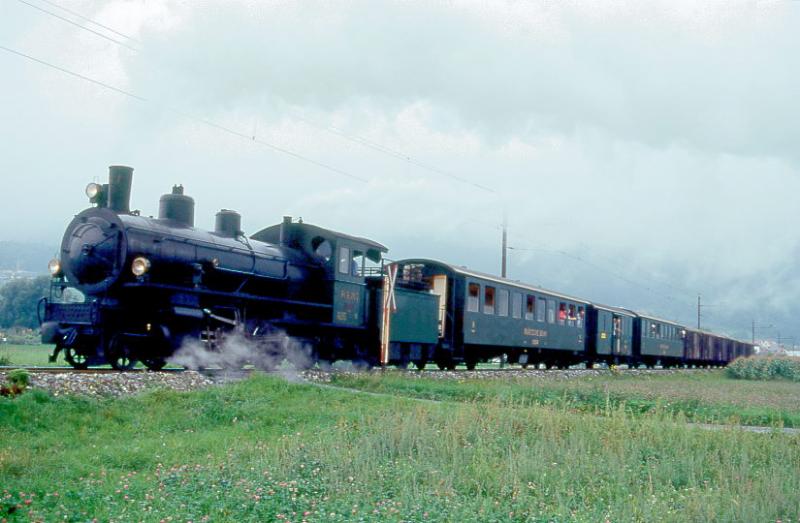 RhB Dampfextra-GmP für RHÄTIA INCOMING 3032 von Davos-Platz nach Landquart vom 25.08.1995 in Malans mit Dampflok G 4/5 107 - B 2246 - D² 4052I - B 2247 - Gbkv 5539 - Gbkv 5568 - Gb 5086 - Gb 5809 - Gb 5018 - Gb 5080. Hinweis: Kreuzungshalt bei ziemlich tiefhängenden Wolken und schlechten Lichtverhältnissen. Ein solch langer fotogener Dampf-GmP kann nur auf die Reise geschickt werden wenn es zahlende Fotografen gibt. Manfred Möldner