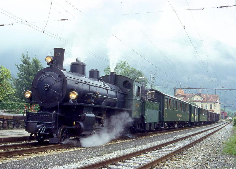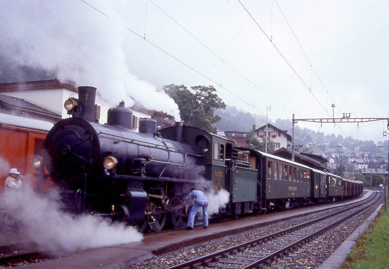 RhB Dampfextra-GmP 3032 von Davos-Platz nach Landquart vom 25.08.1995 bei Bereitstellung in Davos-Platz mit Dampflok G 4/5 107. Hinweis: auch eine Schmalspurdampflok hat bei sehr schlechten Wetter ihren Reiz. Hatte nur 100er Diafilm zur Verfügung. Aufnahme mit Blende 3,5 und 1/15 Sekunde Belichtungszeit, dazu Freihand bei Regen! Manfred Möldner