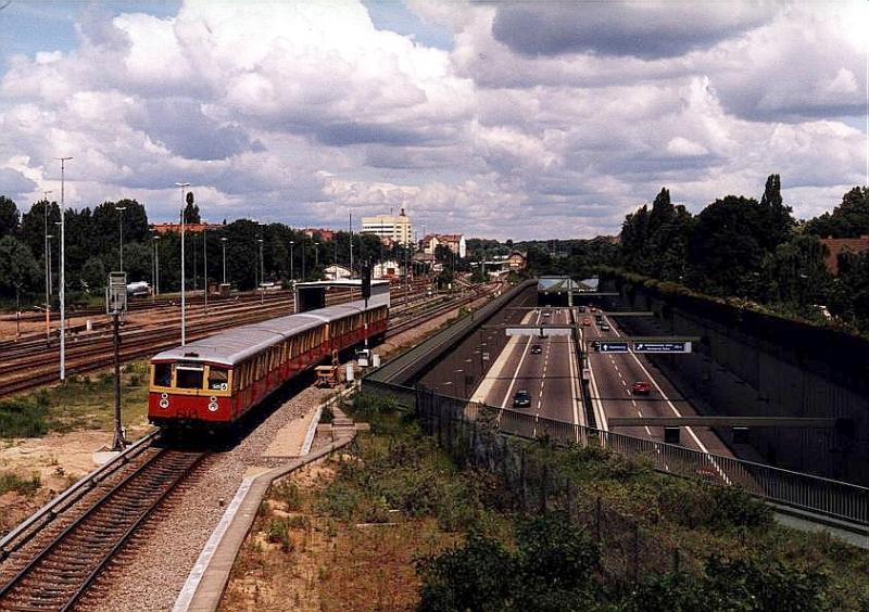 Ein 475/875er-Halbzug nach Lichterfelde Ost in Eichborndamm bei der Ausfahrt-Sommer 1995