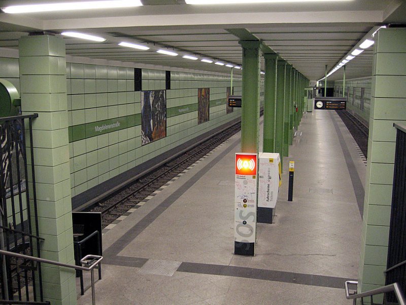 U-Bahnhof Magdalenenstrasse: 1930 eröffnet unter der Frankfurter Allee gelegener Bahnhof der die Kennfarben grün bekommen hat. Interessant sind die an den Wänden angebrachten DDR-Auftragskunstwerke, die auf Meissener Klinker gebrannt wurden. Sie zeigen die deutsche Geschichte im 20.Jhdt, teils in abstrakter Form. 1995 wollte man Werbetafeln darüber anbringen was jedoch vom Kultursenat verhindert wurde. C-R