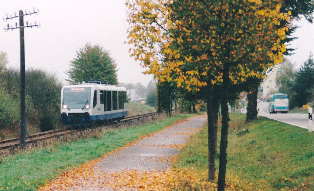 Der RegioSprinter der Dürener Kreisbahn auf Sonderfahrt nach Nördlingen am 13.10.95 etwa 500 Meter südlich von Dinkelsbühl.
