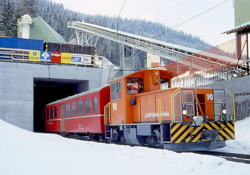 RhB Kurswagen-Extrazug von Schnellzug 45 von Landqart nach Davos-Platz mit Kurswagenlauf von Landquart nach Selfranga für Verein Rollmaterialverzeichnis der Schweiz mit Diesel-Traktor Tmf 2/2 90 - B 2323 von Klosters nach Selfranga vom 30.03.1996, hier Fotohalt Südportal des Zugwaldtunnels. Hinweis: Dies war der 1. Personenzug, der Selfranga erreichte. Manfred Möldner