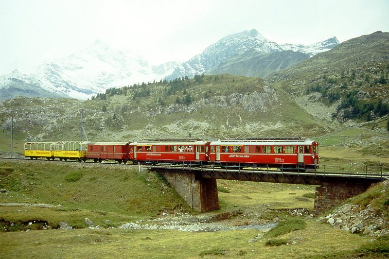 RhB Aussichtswagen-Extrazug 3962 für RHÄTIA TOURS von Alp Grüm nach Pontresina am 30.08.1996 auf Brücke kurz vor Bernina Lagalb mit Triebwagen ABe 4/4 I 34 - ABe 4/4 I 30 - D² 4035 - B² 2093 - B² 2097. Hinweis: Die beiden Triebwagen sind inzwischen in gelb umlackiert, gescanntes Dia.