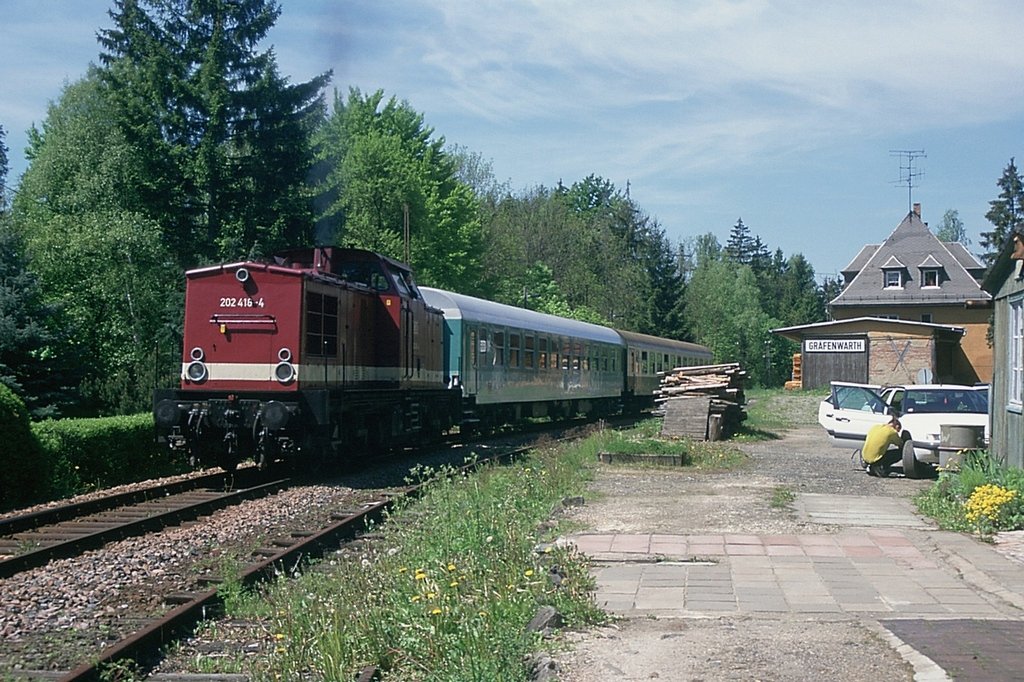 Aus dem Dia-Archiv: 202 368 kommt mit RB8659 von Saalburg und wird gleich den Bf Schleiz erreichen. Noch einen Tag und der Betrieb auf der Strecke nach Saalburg ist ein Fall für die Geschichtsbücher. (31.05.1996) Rüdiger Ulrich