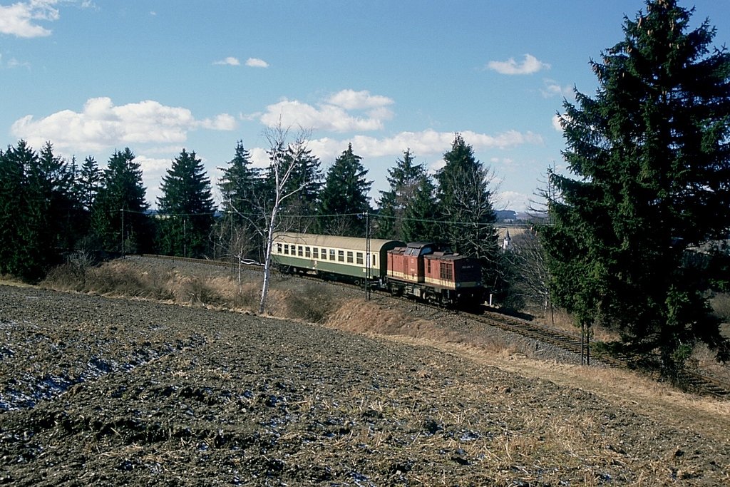 Aus dem Dia-Archiv: 202 240 + RB8659 unterwegs zwischen Burgk und Möschlitz, auf der Strecke von Schleiz nach Saalburg. Leere Züge waren dort leider an der Tagesordnung. Fahrzeiten/Anschlüsse die Arbeiter-/Schülerverkehr verhinderten, dazu nur in Schleiz, Gräfenwarth und Saalburg der Bf im Ort, dass gab dieser Strecke den Rest. (27.02.1996) Rüdiger Ulrich