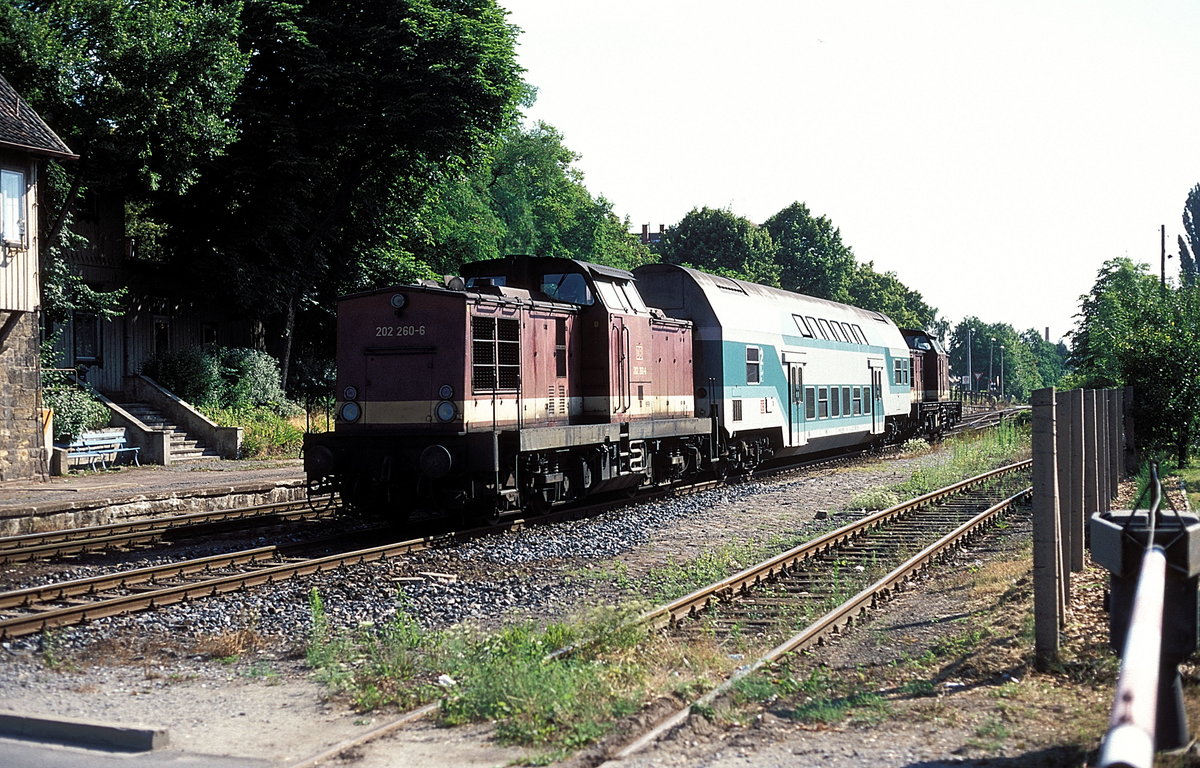 Lutherstadt Wittenberg am 16.5.1996 bei Elbehochwasser:202674 kommt um 10.27 Uhr mit einem nicht mehr zeitgemäßem Wagenpark des RB 5236 aus Pretsch. Gerd Hahn