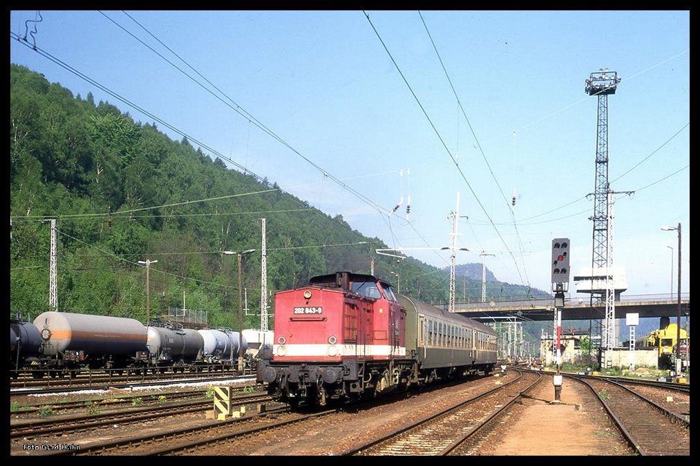 In der Steigung zwischen Wetterabrücke und Gräfenwarth ist 202 368 + RB8659, am 31.05.1996, auf der Fahrt nach Schleiz. Am nächsten Tag werden hier letztmalig Züge fahren. (KB-Dia) Rüdiger Ulrich