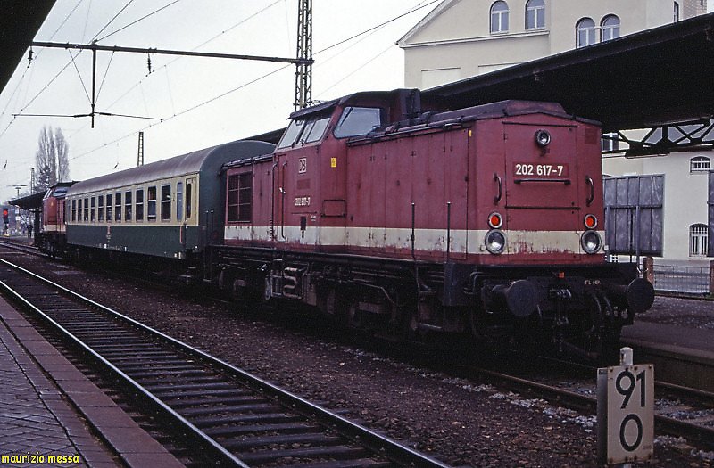 202 809 und 202 651 am Zugende im Sommer 1997 mit dem Personenzug Lauterbach-Bergen/Rügen in Putbus.Die Züge wurden später von 628 Triebwagen abgelöst. Mirko Schmidt