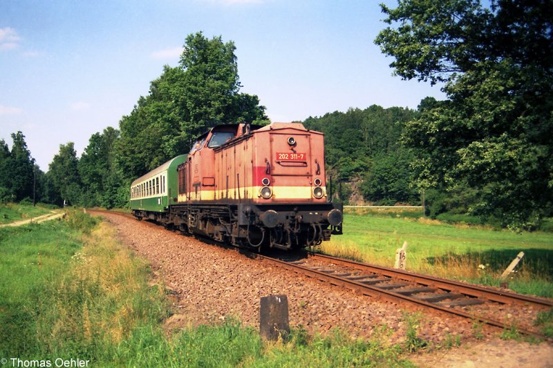 In einem ziemlich verwahrlosten Zustand befindet sich 202 311 im Sommer 1997, als sie mit ihrem kurzen Zug zwischen Hp Auerswalde-Köthensdorf und dem Auerswalder Tunnel unterwegs ist. Thomas Oehler