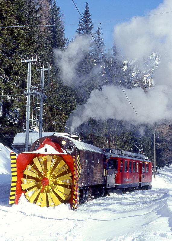 RhB Dampfschneeschleuder-Extrazug für GRAUBÜNDEN TOURS 9448 von Alp Grüm nach Ospizio Bernina am 31.01.1998 bei Scala zwischen Alp Grüm und Ospizio Bernina mit Dampfschneeschleuder X d rot 9213 - Triebwagen ABe 4/4II 41. Hinweis: gescanntes Dia