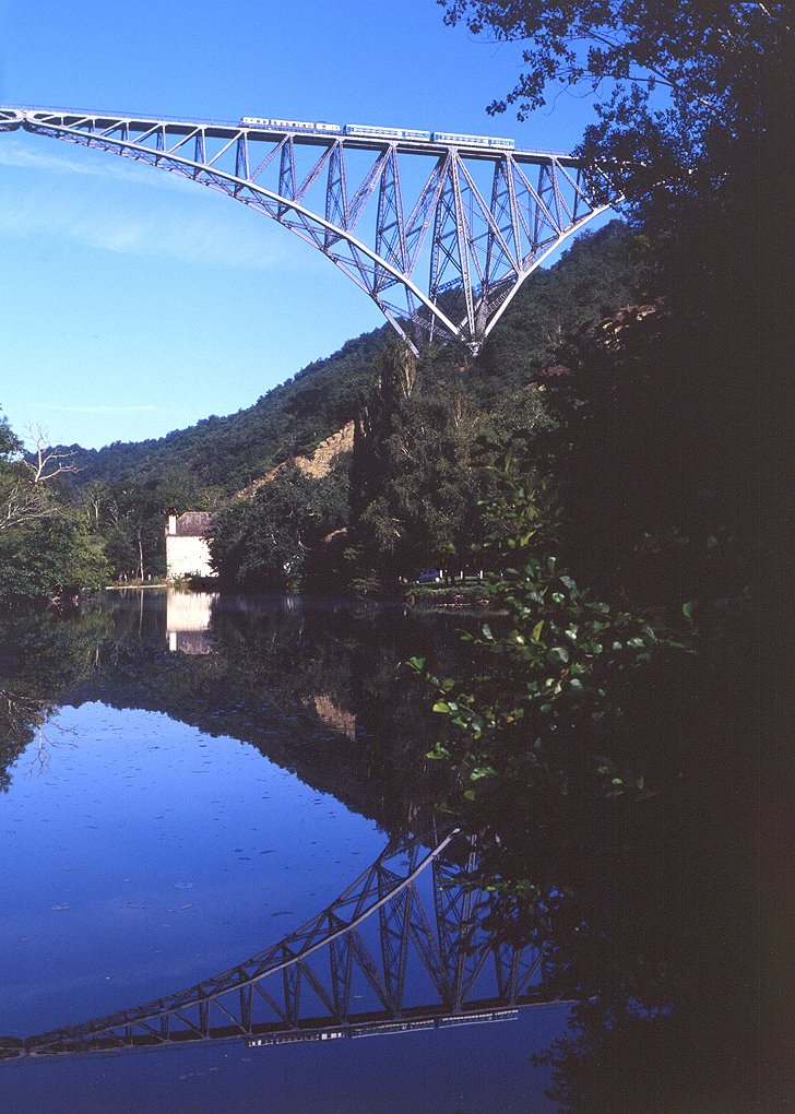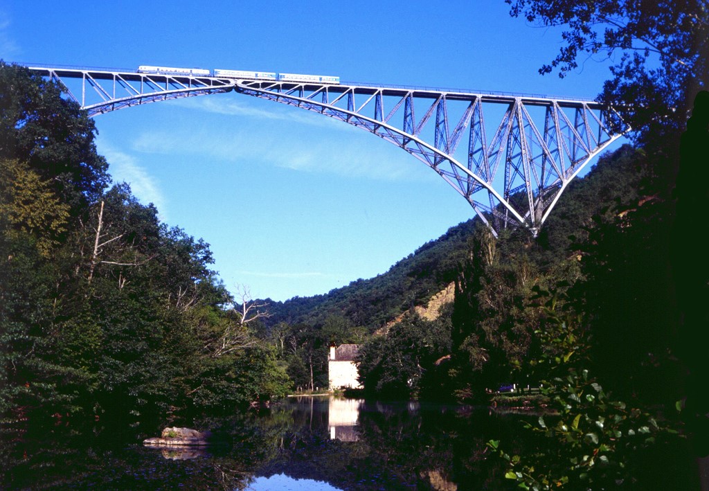 Ein x2800 mit zwei Beiwagen überquert den Viaduc du Viaur, 29.08.1998, Zug 98997. .