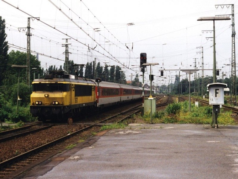 In Emmerich gab es zehn Jahre zurück auch noch viele Lokwechsel zwischen DB und NS. Hier fahrt die 1611 mit EC 145 Amsterdam CS-Köln Hbf ein auf Bahnhof Emmerich am 15-7-1998. Bild und scan: Date Jan de Vries.