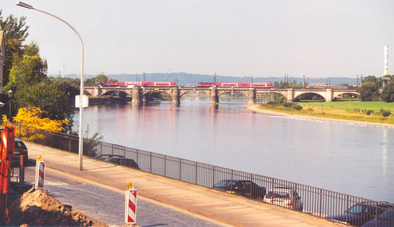 Zugkreuzung vor Dresden HB. Zwei Baureihe 112/114 mit Dosto Wagen. Gescannt von Photoarchiv aus dem Jahre 1999.
