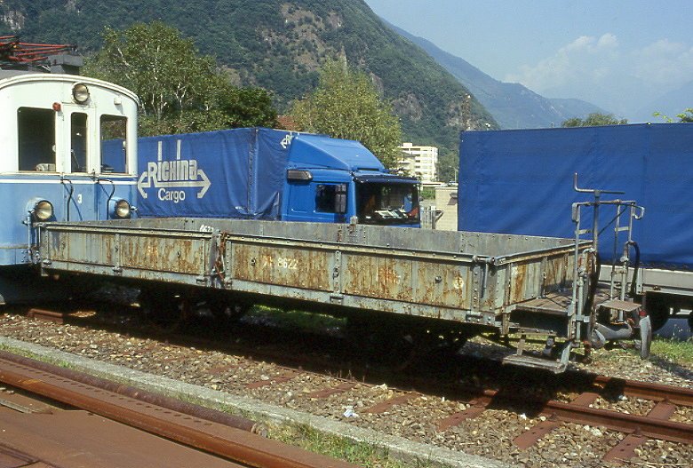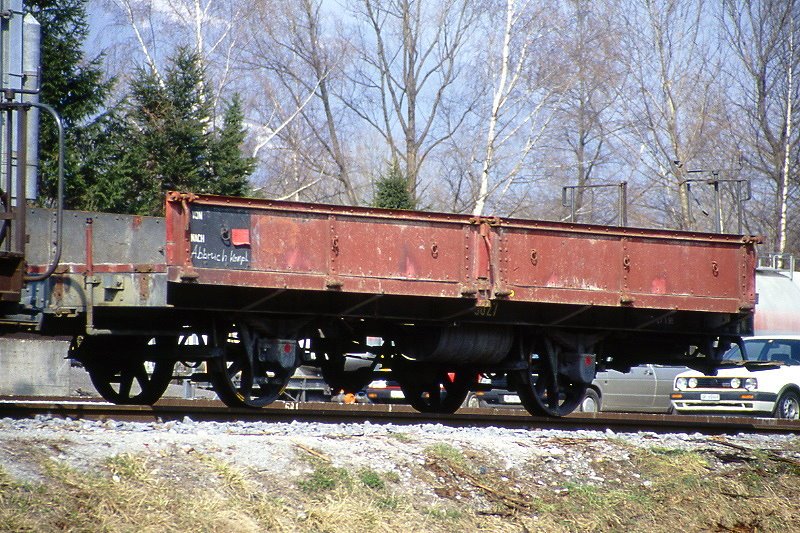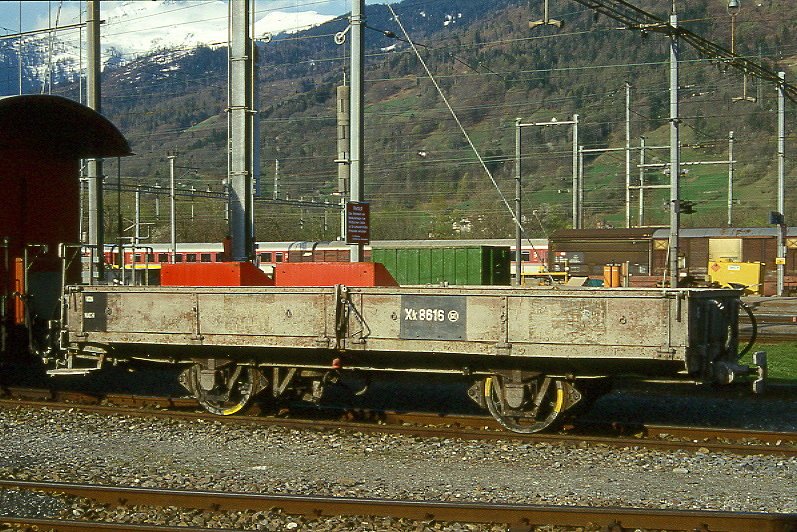RhB - Xk 8616 II am 23.04.1999 in Landquart - Niederbord-Dienstwagen 2-achsig mit 1 offenen Plattform - Baujahr 1896 - SIG - Gewicht 4,80t - Zuladung 10,00t - LüP 7,45m - zulässige Geschwindigkeit Aufkleber 60 km/h - ®=26.02.1992 - Lebenslauf: ex M 227 - 1899 M 1127 - 1911 S 8627 - 1926 S 8616 II - 1969 Xk 8616 II