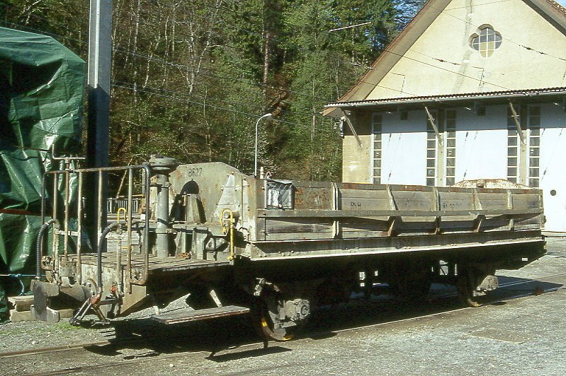 RhB - Xk 8627 II am 25.04.1999 in Chur Sand - Kipp-Dienstwagen 2-achsig mit 1 offenen Plattform - Baujahr 1931 - SIG - Gewicht 7,80t - Zuladung 15,00t - LüP 8,50m - zulässige Geschwindigkeit Aufkleber 60 km/h - ®=03.1991 - Lebenslauf: ex ChSA Sk 501 - 1942 RhB Sk 8527 II - 1969 Xk 8627 II