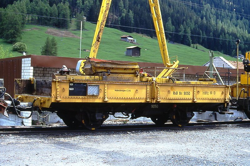 RhB - Xkl 9050 II am 30.05.1992 in Davos Platz - Materialwagen zu C 312 - 2-achsig mit 1 offenen Plattform - Baujahr 1906 - Staud - Gewicht 5,33t - Ladegewicht 10,00t - LüP 7,49 m - zulässige Geschwindigkeit 55/B km/h - ®3=10.02.1984 - Lebenslauf: ex M 1217 - 1911 M 7087 - 1969 Kkl 7087 - 10.02.1984 Xkl 9050 II - 03/1999 P 10165 Müller AG