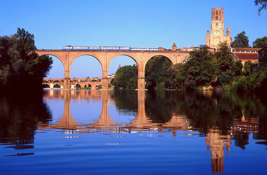 Ein x2800 mit zwei Beiwagen überquert den Tarn bei Albi vor der Kulisse der Cathedrale Sainte-Cécile, 31.08.1999.