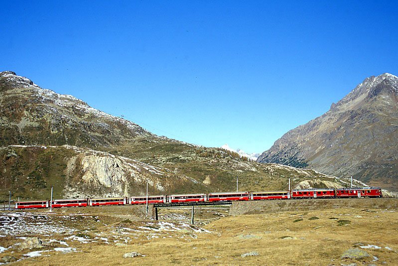 RhB Bernina-Express A 501 von Chur nach Tirano am 11.10.1999 auf Brücke am Lago Bianco mit Triebwagen ABe 4/4 II 41 - ABe 4/4 II 43 - A 1275 - A 1274 - B 2496 - B 2492 - B 2491 - B 2493 - BD 2475 - Hinweis: heute verkehrt der Zug mit Panoramawagen, diese Berninawagen-Garnitur EW-IV ist inzwischen rot lackiert. In den nächsten Jahren wird wegen genehmigter Staudammerhöhung die Bahnlinie hier höher neu gebaut.