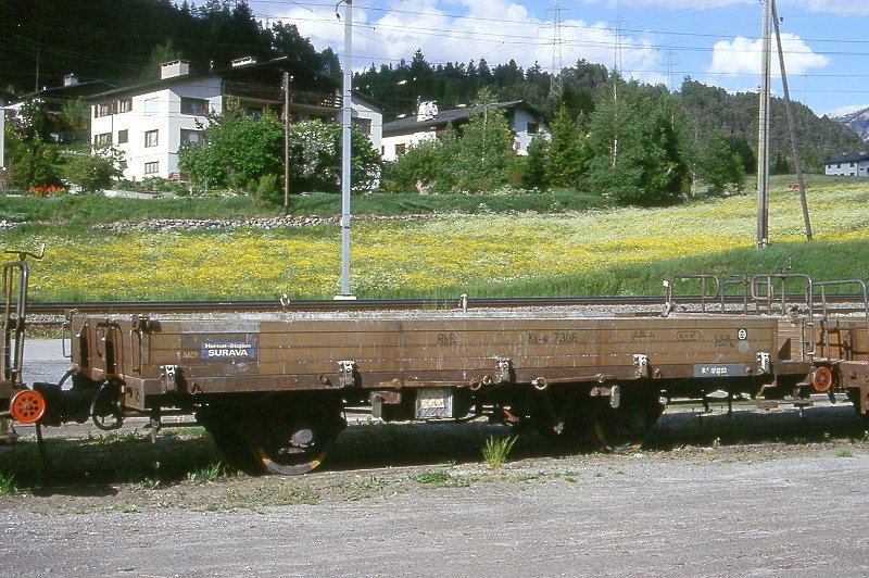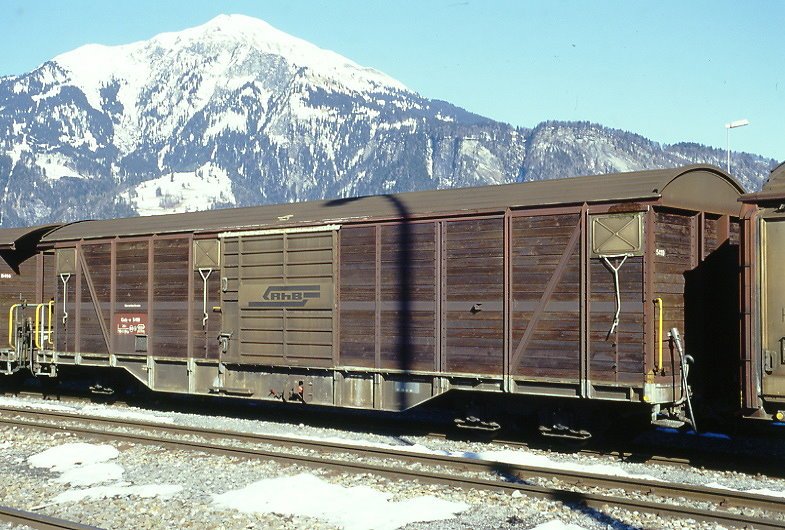 RhB - Gak-v 5419 am 27.02.2000 in Landquart Ried - Gedeckter Güterwagen 4-achsig mit 1 offenen Plattform - Übernahme: 26.04.1979 - JMR - Gewicht 14,45t - Zuladung 26,00t - LüP 14,47m - zulässige Geschwindigkeit 80 km/h mit Aufkleber B - Hinweis: die Fahrzeugserie besteht aus 20 Wagen mit den Nummern 5401 bis 5420, gescanntes Dia