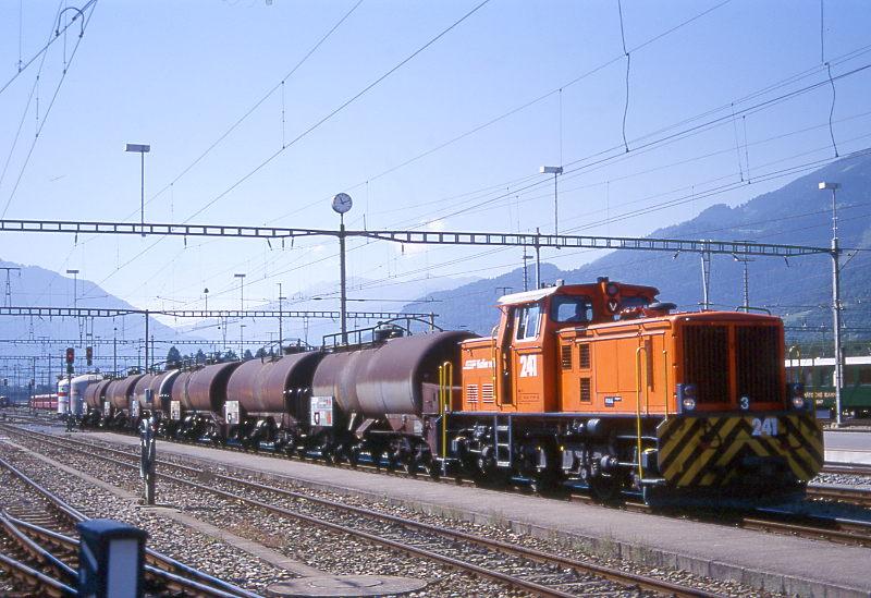 RhB Übergabezug von Landquart-Ried nach Landquart mit Diesel-Lok Gm 4/4 241 - 6x Uah - 2x Uce vom 23.08.2000 in Landquart und Bereitstellung für einen Güterzug. Manfred Möldner
