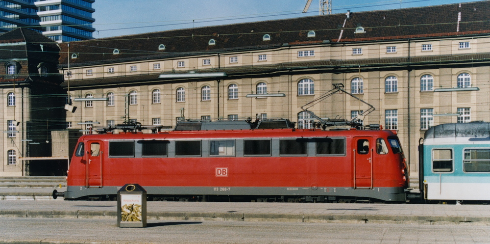 stand 113 268-7 vor ihrem Zug im Münchner Hauptbahnhof.