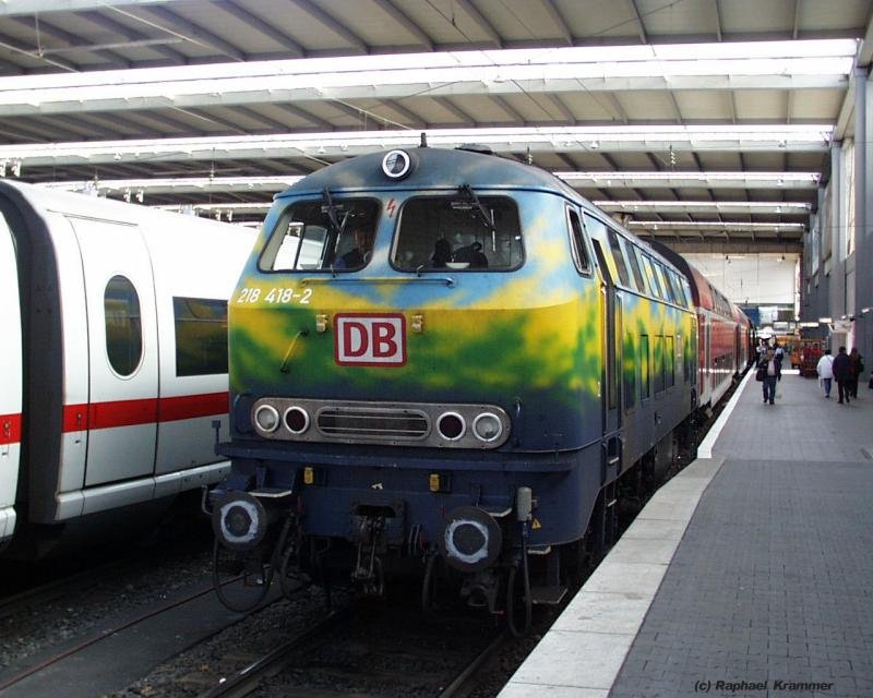 Auch vor der Vielzahl von privaten EVUs gab es "Buntes" zu fotographieren: 218 418-2 in Touristikzuglackierung im Herbst 2001 vor einem DOSTO-Nahverkehrszug (Aufnahme: München Hauptbahnhof) Raphael Krammer
