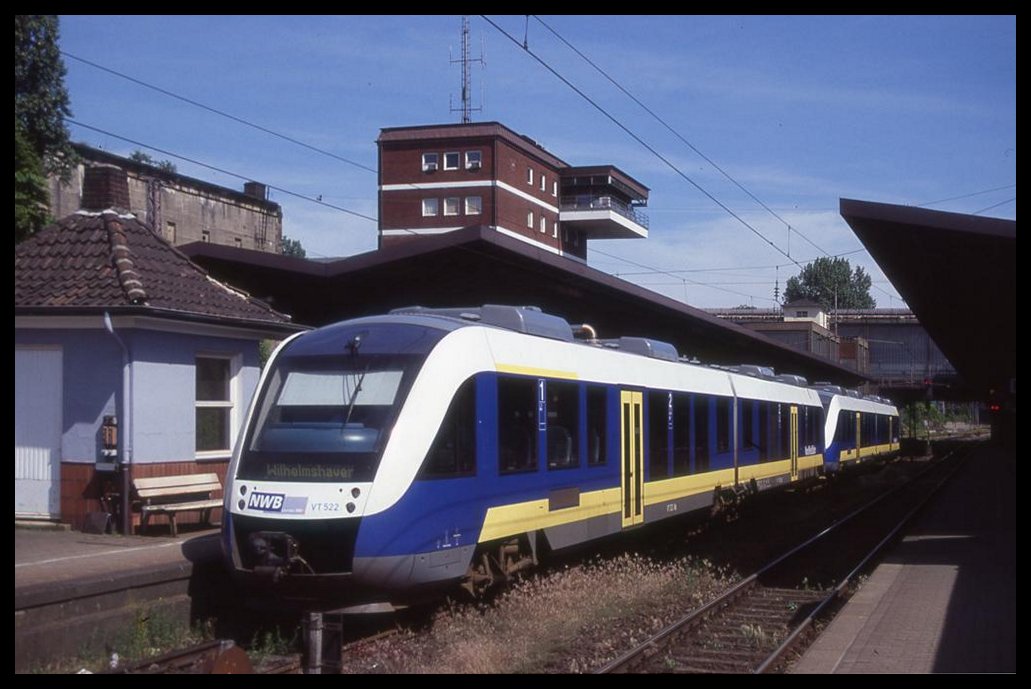 NWB VT 522 steht hier abfahrbereit nach Wilhelmshaven an 26,96.2001 im unteren Teil des HBF Osnabrück. Im Hintergrund links ist der alte Hochbunker aus Kriegszeiten und daneben das Stellwerk des HBF zu sehen. Gerd Hahn