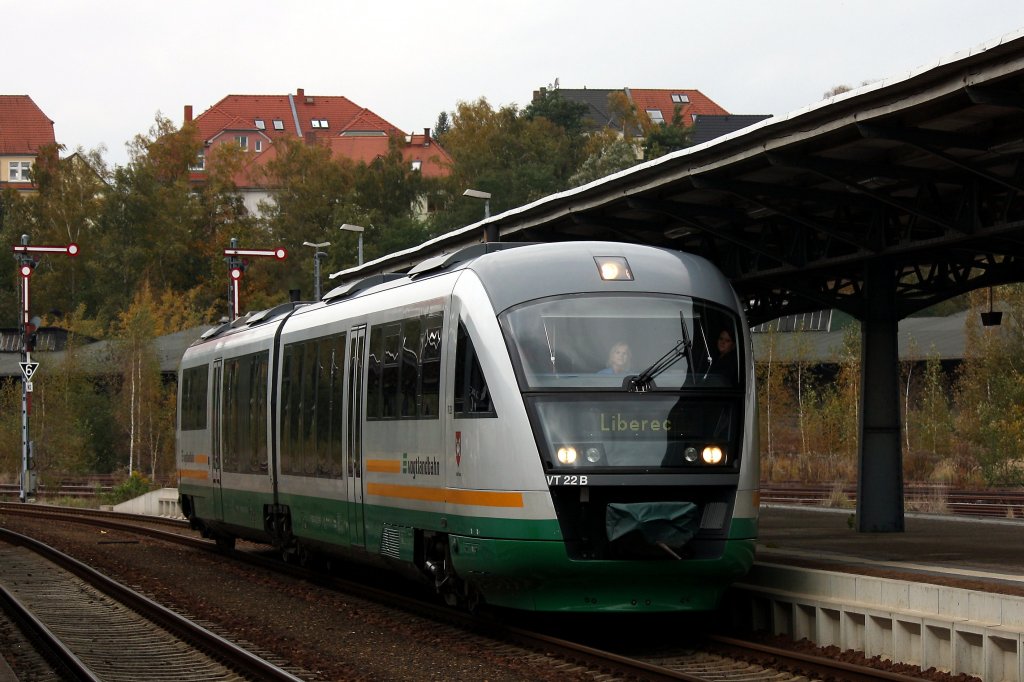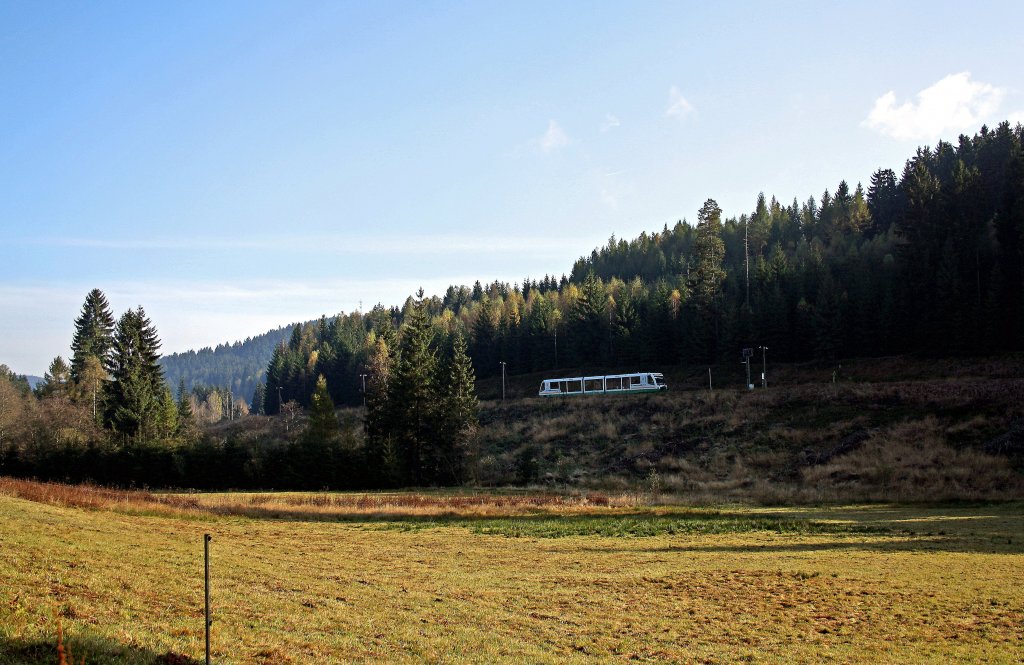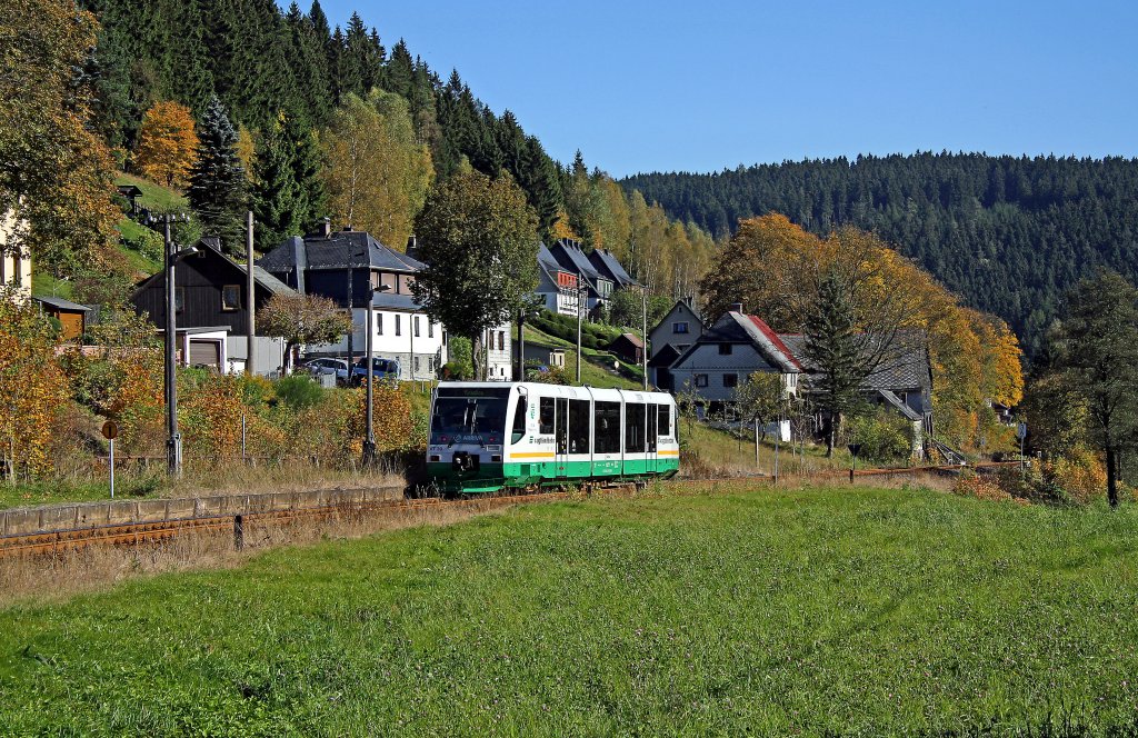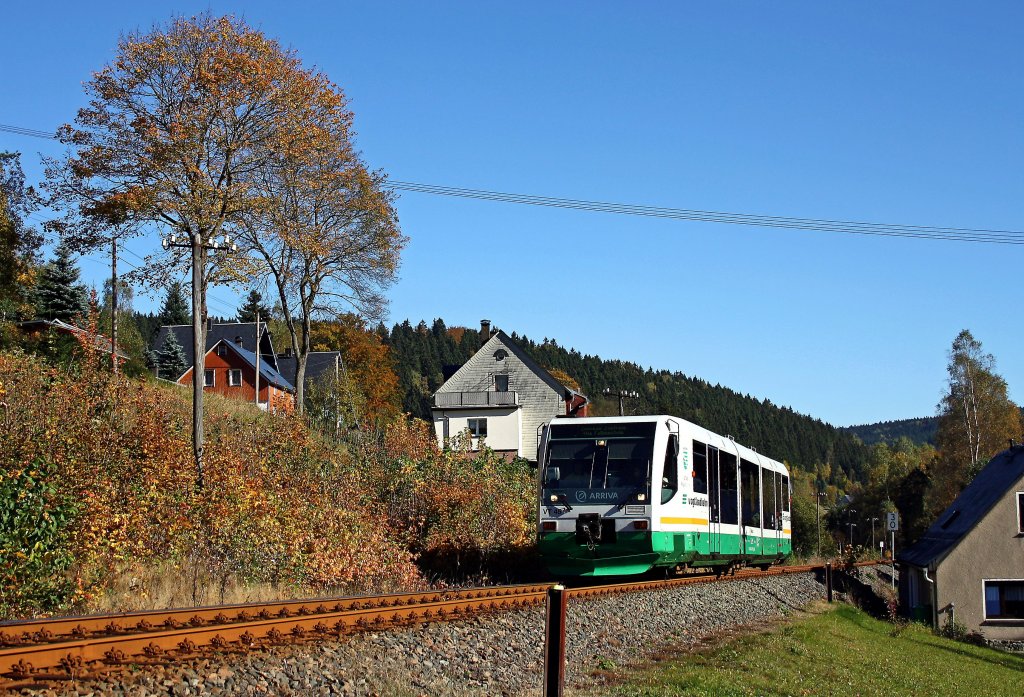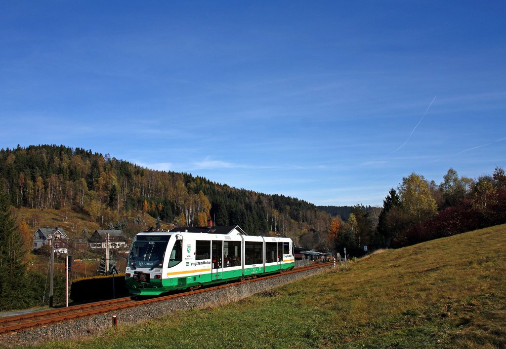 654 043 (VT43) und 654 034 (VT34 "Stadt Auerbach im Vogtland") als VBG83109/83209 Zwickau/Plauen(V) - Graslitz ( - Karlsbad - Marienbad) zwischen Zwota und Klingenthal, 30.10.010. Kevin Friedel