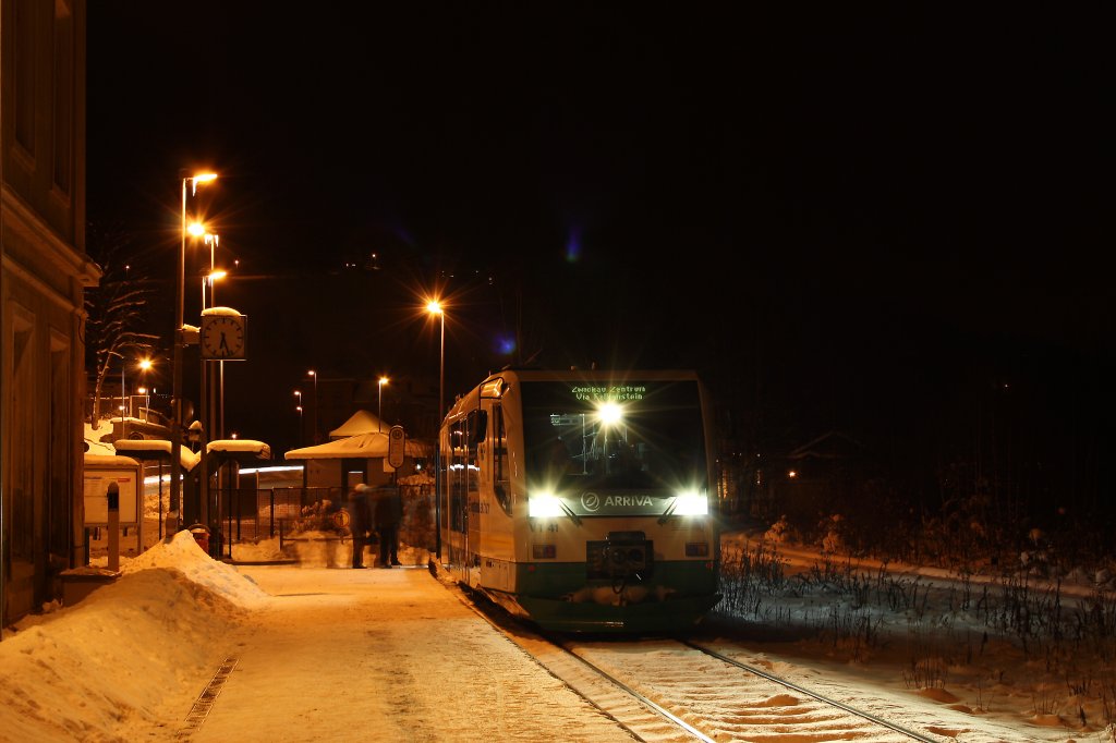 Ein RegioSprinter der Vogtlandbahn überquert am 4.12.010 als VBG83127 Zwickau - Graslitz ( - Falkenau) die Eiserne Brücke in Klingenthal. Das Bauwerk ist immer zur Weihnachtszeit Sachsens größter Lichterbogen. Kevin Friedel