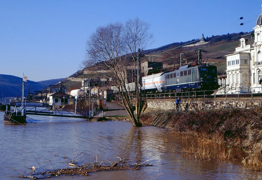 DB 143029-7 ist hier am 3.10.2002 um 14.15 Uhr mit einem Regionalzug unterhalb der Burg Maus auf der rechtsrheinischen Strecke in Richtung Koblenz unterwegs. Gerd Hahn