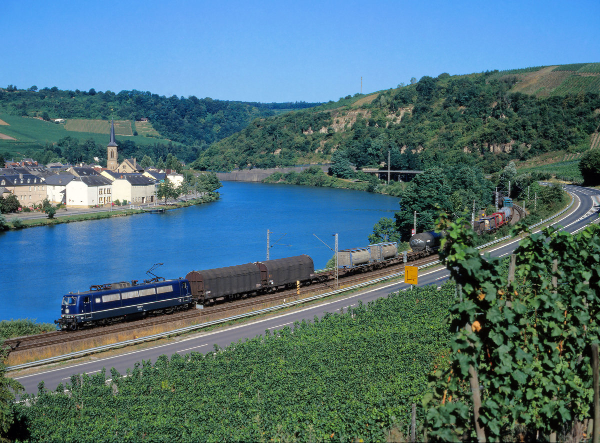 Ein Traum in blau: 181 001 mit dem TC 44516 von Ehrang nach Apach am 28.07.2002 bei Nittel. Auf der anderen Seite der Mosel befindet sich bereits das Großherzogtum Luxemburg. Michael Beitelsmann