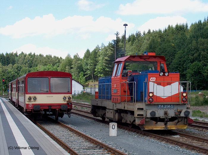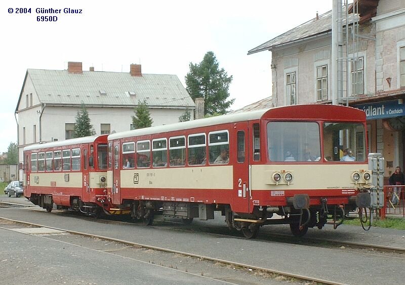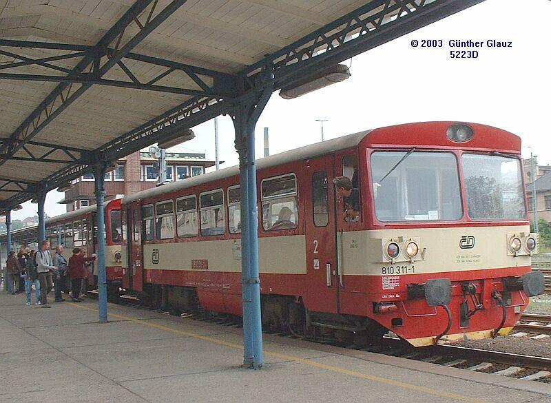 810 311-1 mit Beiwagen BR 010 am 05.07.2003 auf der Fahrt von Varnsdorf nach Liberec in Zittau am tschechischen Bahnsteig. Die Grenzkontrolle durch deutsche und tschechische Beamte erfolgt am Anfang dieses Bahnsteiges. Günther Glauz