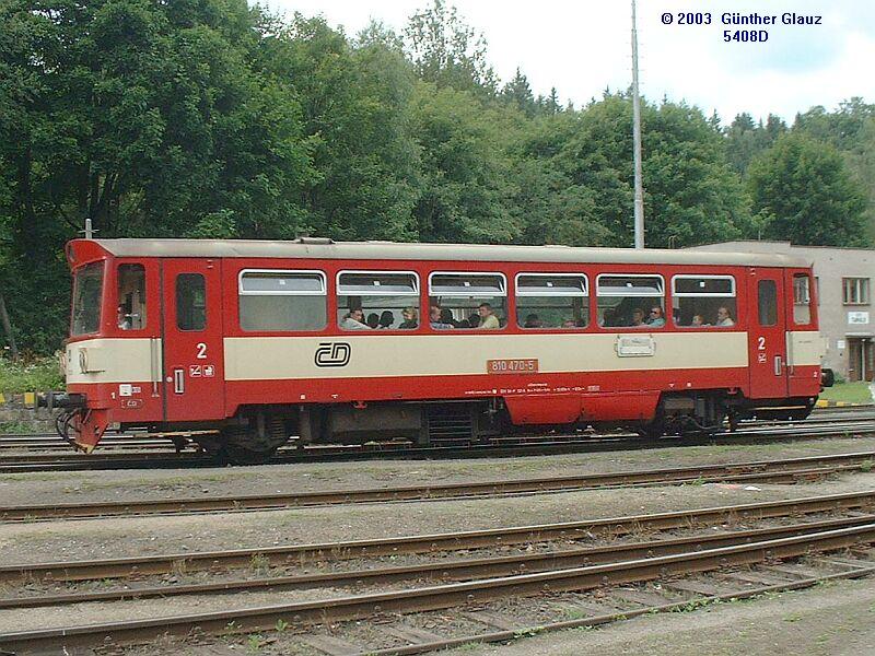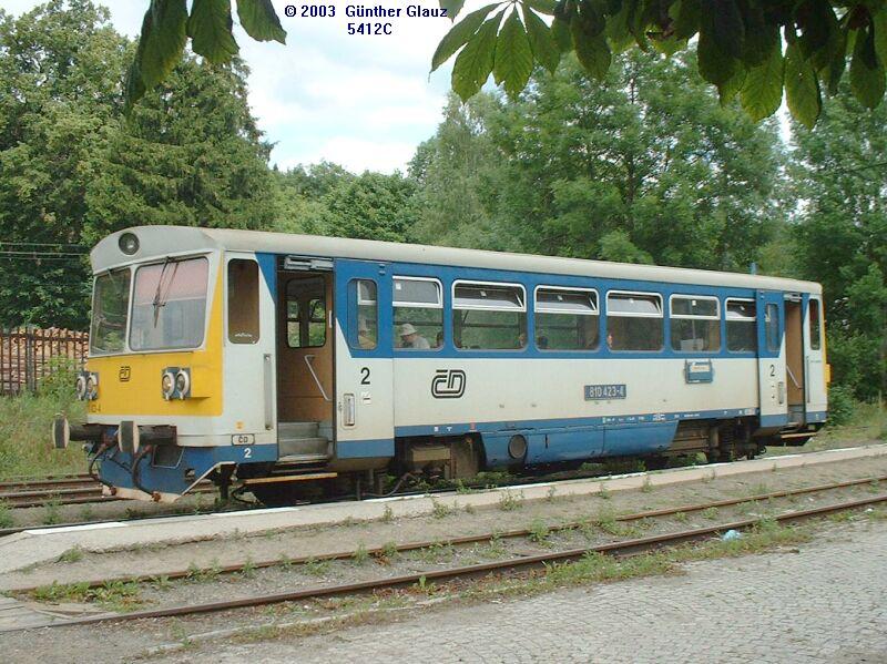 810 423-4 in moderner Lackierung am 16.07.2003 in Josefuv Dul (Joseftal / Isergebirge). Nach Josefuv Dul geht eine kurze Stichstrecke, sie zweigt in Smrzovka von der Strecke Liberec - Tanvald ab. Günther Glauz
