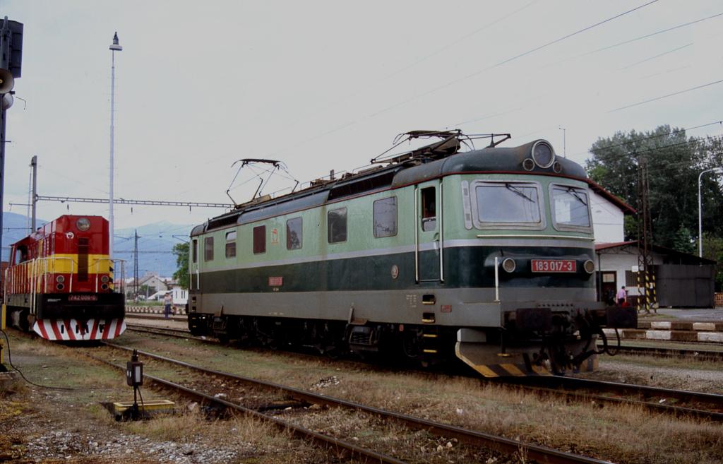 183017 wartet am 10.6.2004 aufgebügelt solo im Martin. Daneben steht abfahrbereit mit einem Güterzug die 742006.