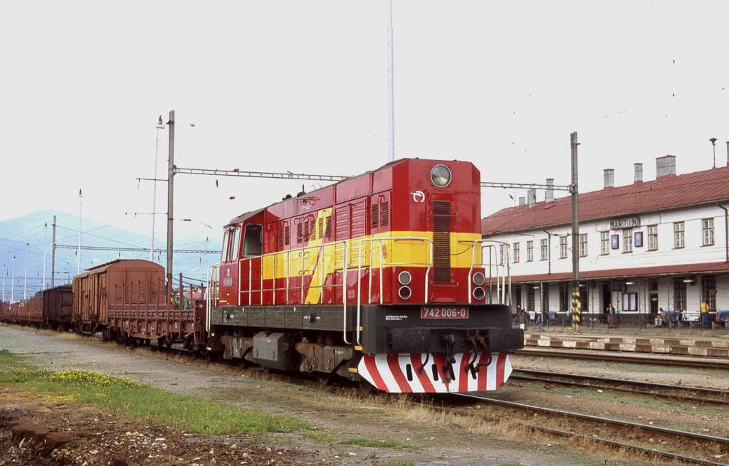 Im Bahnhof Martin wartet 742006 am 4.6.2004 um 16.00Uhr vor ihrem Güterzug auf Ausfahrt in Richtung Zvolen.