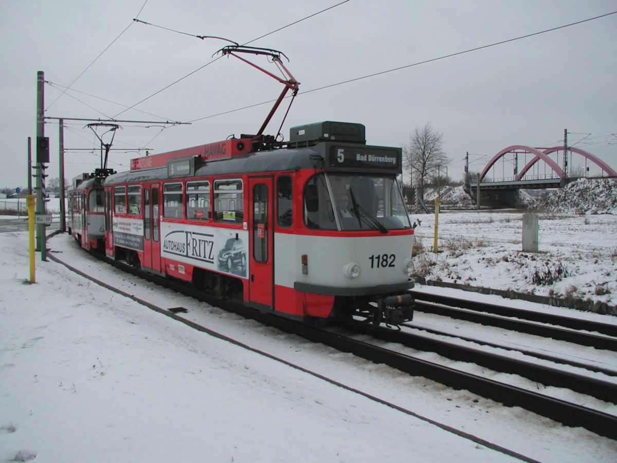 Am 31.01.2005 war ein Tatra-Großzug der Halleschen Verkehrs AG, unter Führung von T4D-C 1182 unterwegs auf Linie 5 von Heide nach Bad Dürrenberg. Hier hat der Zug gerade die Bahnstrecke Leipzig - Weißenfels unterquert und wird in Kürze die Haltestelle Kirchfährendorf erreichen. Michael Brunsch