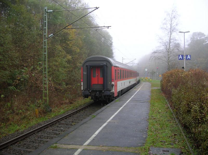 Nachschuss auf den EC 371 (Arhus-Prag), der gerade im Novembergrau verschwindet, nachdem er pünktlich um 10.59 Uhr den Bahnhof von Flensburg verlassen hat. Dieser Zug und der Gegenzug (EC 370) bestehen immer aus tschechischen EC-Waggons. der Mecklenburger