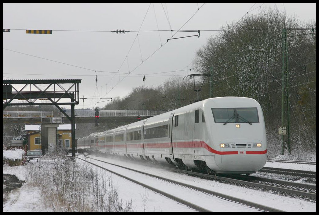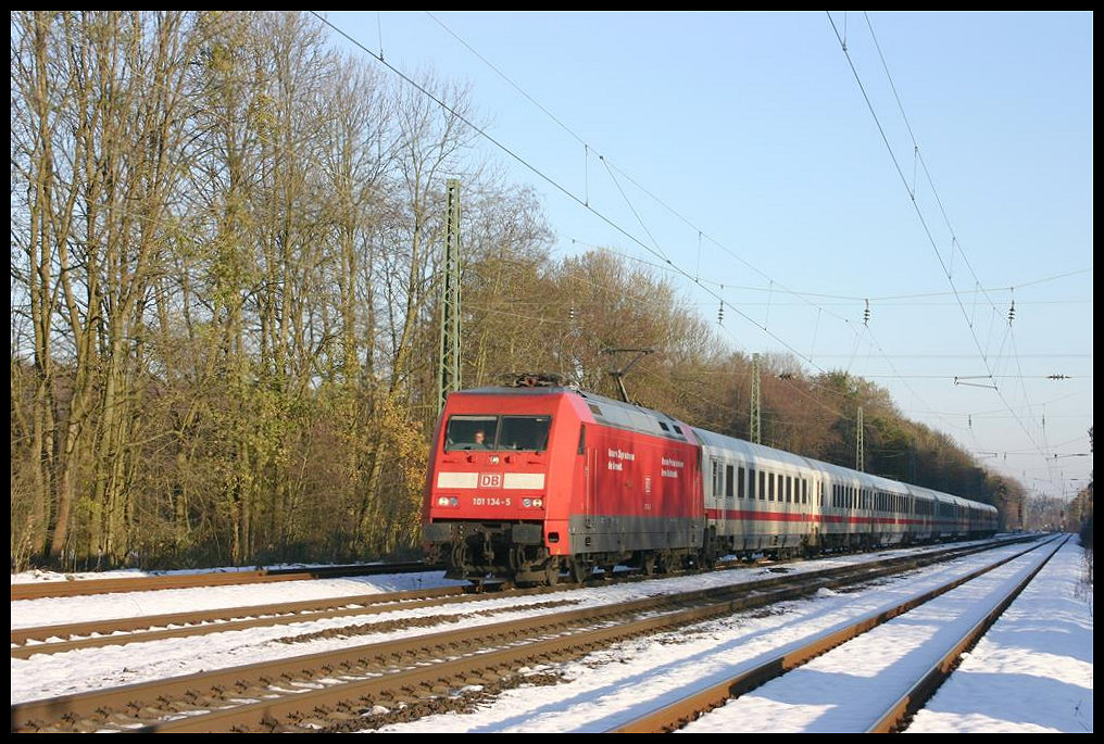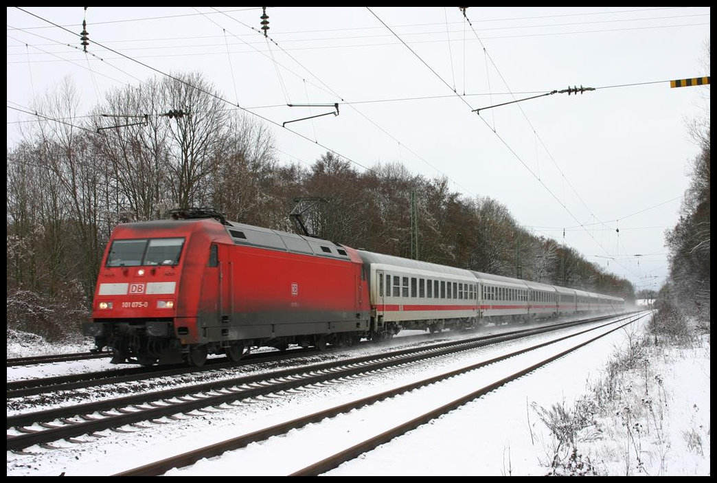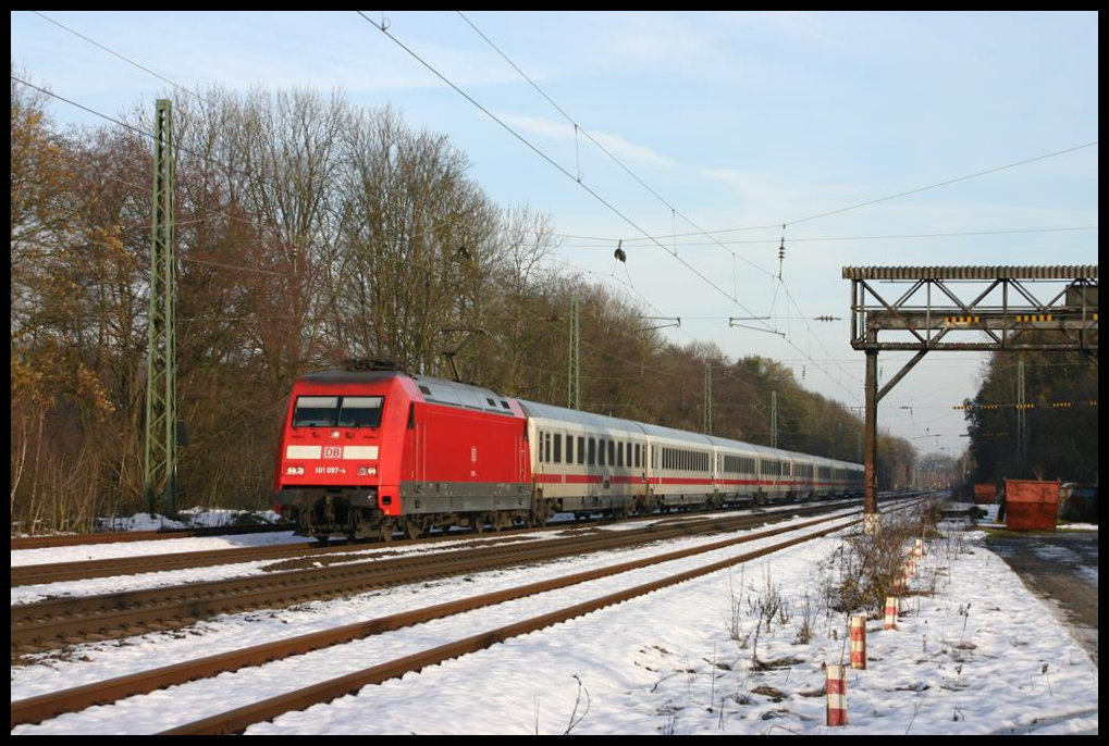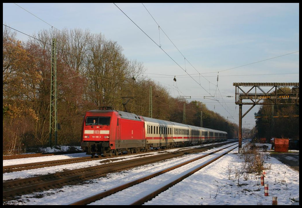 Am 3.12.2005 war der Bahnhof Natrup Hagen mit einer ersten dünnen Schneedecke des Winters versehen, als 101106 mit ihrem Intercity in Richtung Münster über die Rollbahn kam. Gerd Hahn