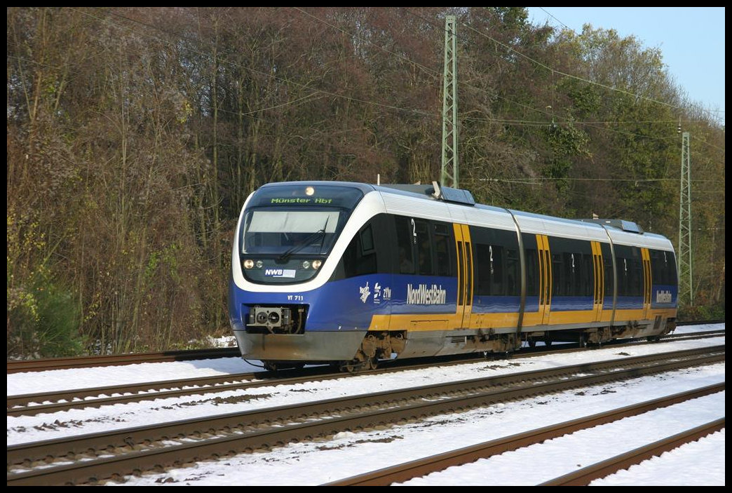 Auf Überführungsfahrt von Osnabrück nach Münster kommt hier am 2.12.2005 um 11.56 Uhr der Nordwestbahn VT 711 durch den Bahnhof Natrup Hagen. Gerd Hahn
