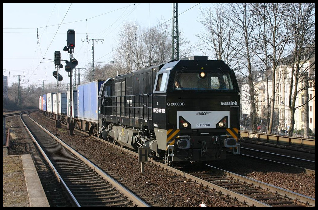 MRCE 500 1608, eine Vossloh 2000 BB, kommt hier am 19.3.2006 um 15.10 Uhr mit einem Container Zug in Richtung Süden fahrend durch den Bahnhof Köln Süd. Gerd Hahn