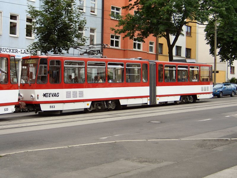 TATRA Triebwagen 553 als Beiwagen eines TATRA-Zuges der Linie 3, hier in der Nordhäuser Strasse in Richtung Domplatz, 2006. Die Einsätze der TATRA-Wagen werden in Erfurt immer seltener. ERHARD BEYER