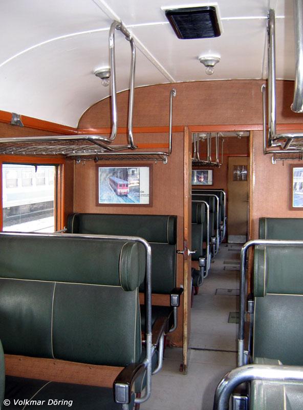 Blick in das Wageninnere von 830 224. Die Einrichtungen zeigen den gut erhaltenen Charme der 60er Jahre (Leuchten, geflochtene Gepäcknetze usw.)