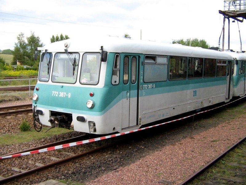Ferkeltaxe 772 312 und 772 367 der Vorwohle - Emmerthaler Verkehrsbetriebe (VEV) auf der Fahrt von Nossen nach Freiberg bei Ausfahrt aus Nossen - 01.10.2006