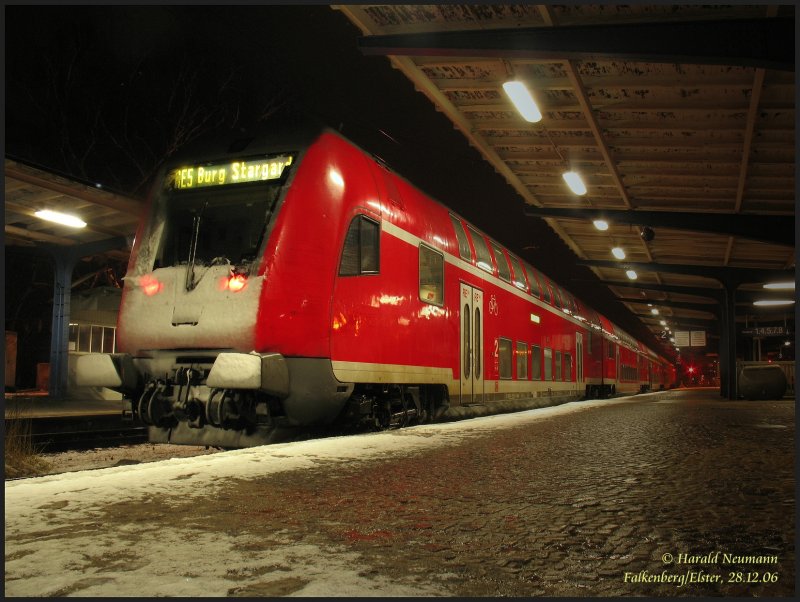 114 012 morgens in Doberlug-Kirchhain oberer Bf mit RE38396 nach Elsterwerda, 27.12.06. (Entgegen dem zuletzten eingestellten Steuerwagenbildes dieses Zuges, wurde hier die Rottönung - auf Wunsch - reduziert.) Harald Neumann