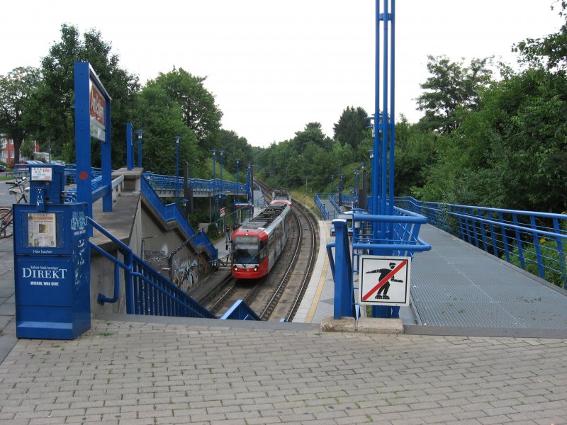 2 unbekannte Wagen vom Typ K5000 am am 06. Juli 2006 in der Haltestelle Am Emberg in Köln-Höhnhaus. ca. 50m vor der Haltestelle wechselt die Straßenbahntrasse von der westlichen Seite der Berliner Straße auf die östliche Seite. Weil die Station in Tieflage ist benötigt man für einen barrierefreien Zugang eine Rmpe, die rechts im Bild zu erkennen ist. Der Zug im Bild fährt stadteinwärts sein Ziel ist Bocklemünd. Johannes Schwarz