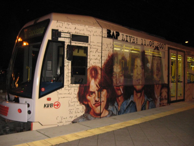 Als ich am 12.12.2006 von meinen Weihnachtseinkäufen nach Hause fuhr, begegnete mir TW 5159 mit seiner Werbung für die Kölner Musik-Gruppe "BAP". Die Aufnahme enstand an meiner Heimathaltestelle "Im Weidenbruch" in Köln-Höhenhaus. Ich habe die Bahn von hinten fotografiert, weil ich den Fahrer nicht mit dem Blitzlicht konfrontieren wollte. Johannes Schwarz