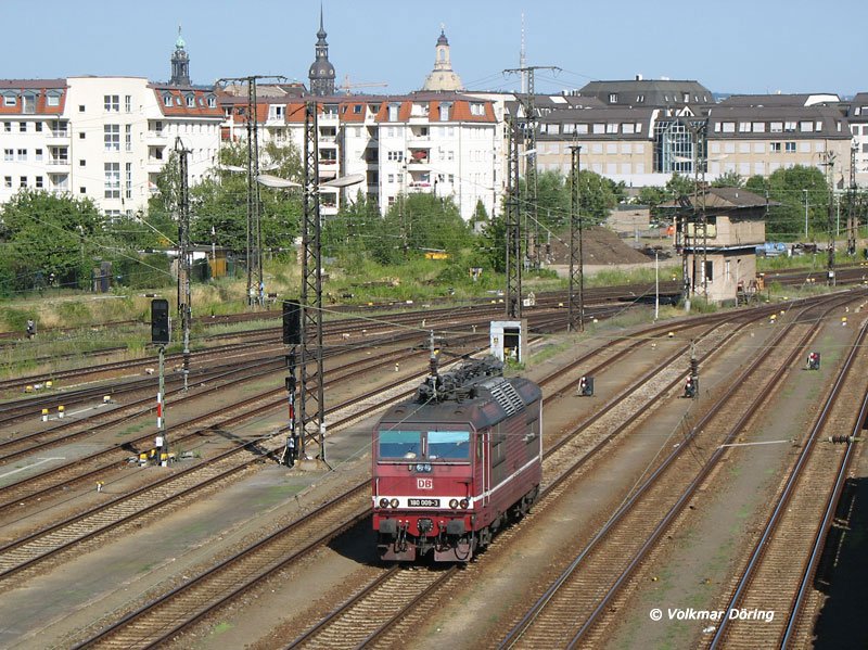 Blick auf den Rangierbahnhof Dresden-Friedrichstadt, wo gerade die HGK (Häfen- und Güterverkehr Köln)-Lok 145-CL 012 abgebügelt auf neuen Einsatz wartet, 28.03.2006